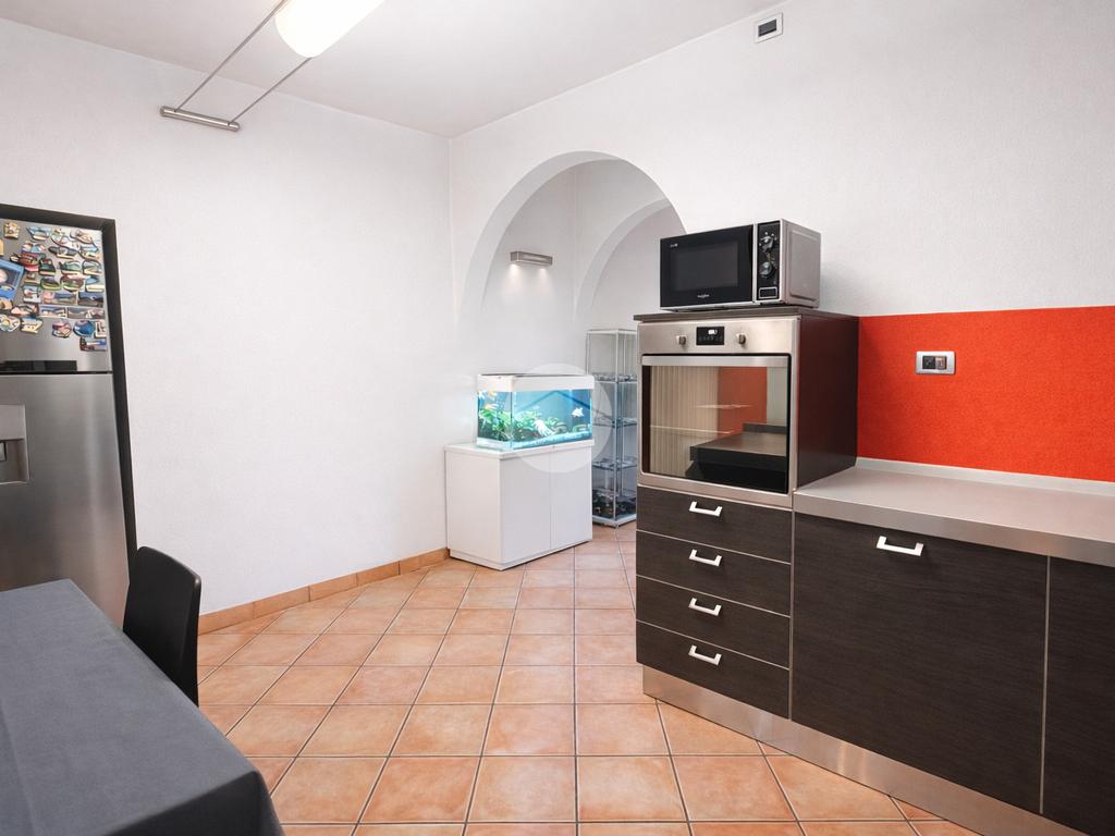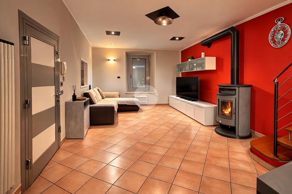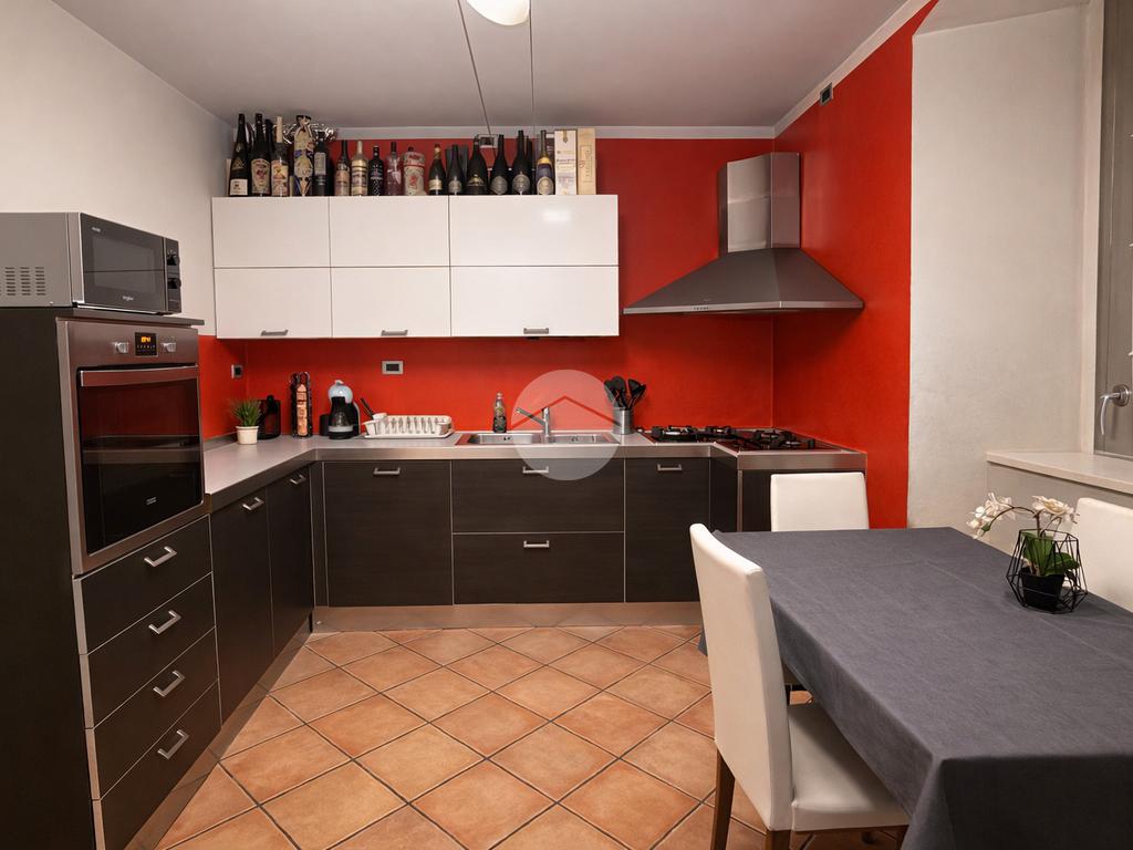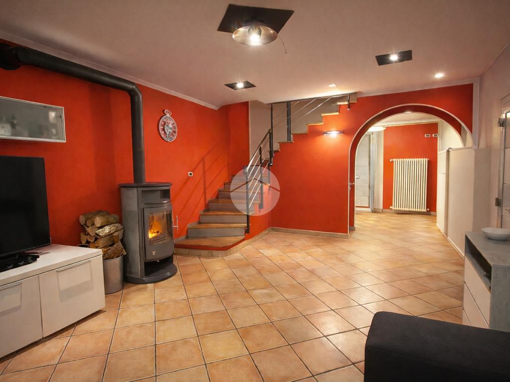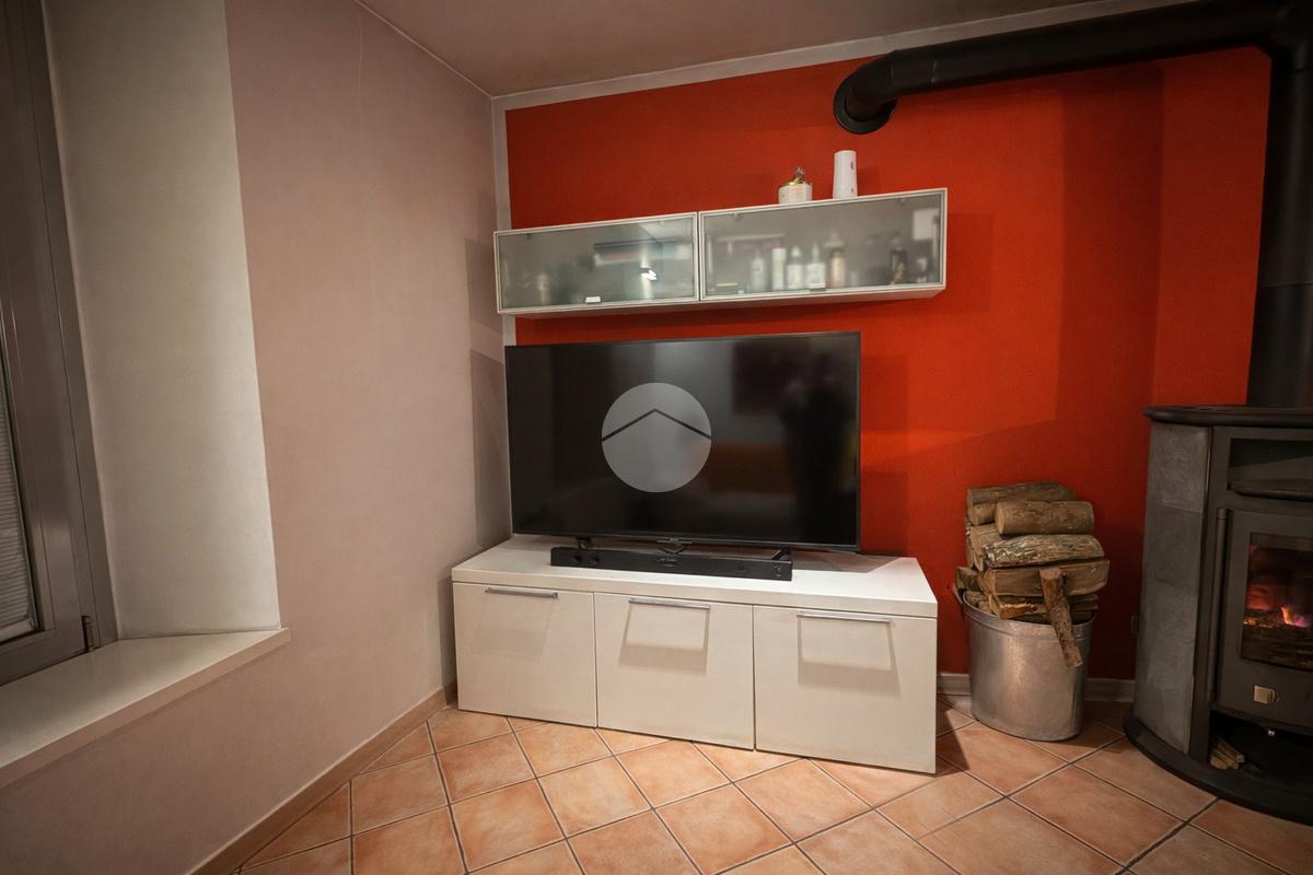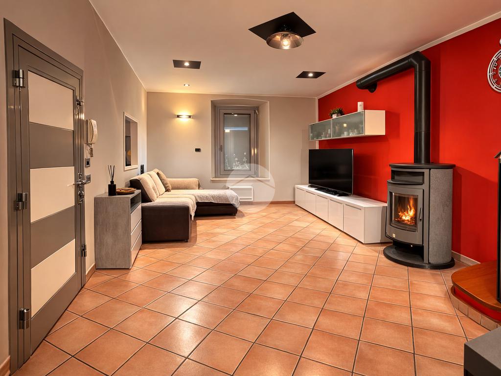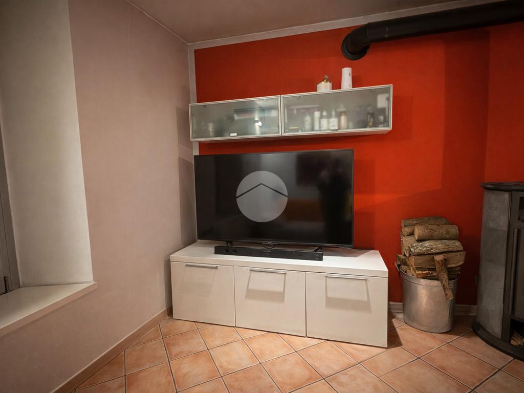 L’ingresso si apre su un grande e luminoso soggiorno, reso particolarmente accogliente dalla presenza di una stufa a legna, ideale per creare un’atmosfera calda e conviviale durante la stagione invernale. Dal soggiorno si accede direttamente alla cucina abitabile, spaziosa e ben organizzata, perfetta per la vita quotidiana.