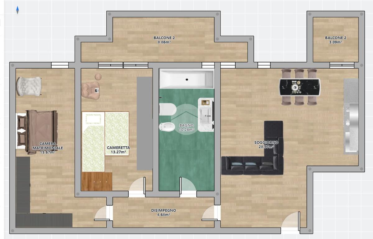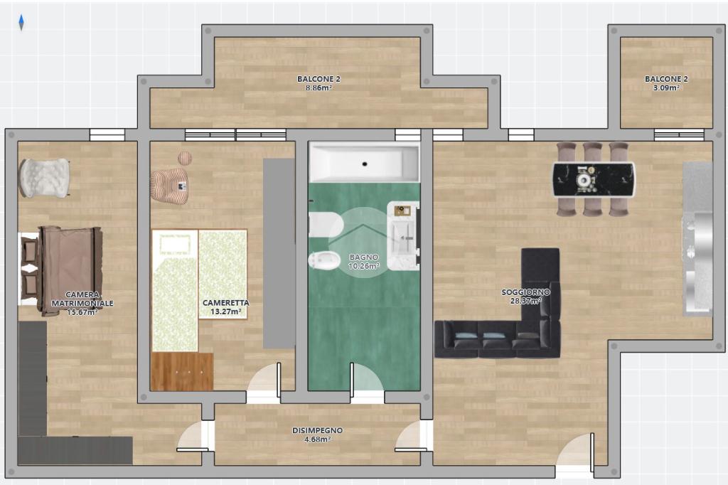L’appartamento si apre su un grande soggiorno, particolarmente luminoso grazie all’ottima esposizione solare, collegato direttamente alla cucina abitabile, creando un ambiente accogliente e funzionale per la vita quotidiana. La zona notte è composta da una spaziosa camera matrimoniale, una seconda camera doppia adatta a bambini e un bagno finestrato dotato di vasca.