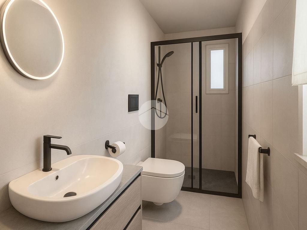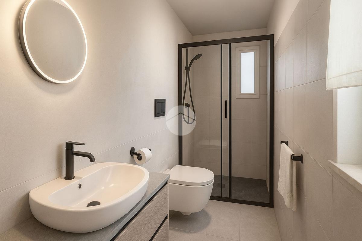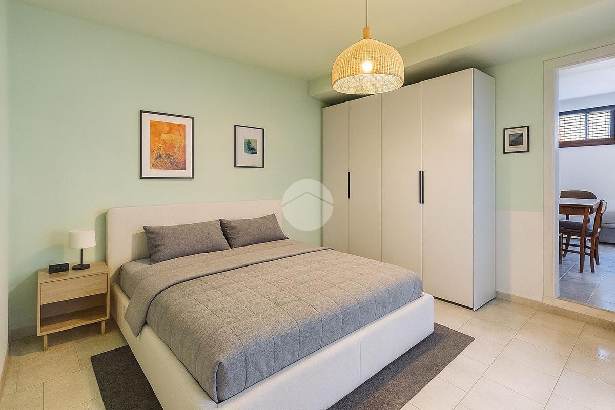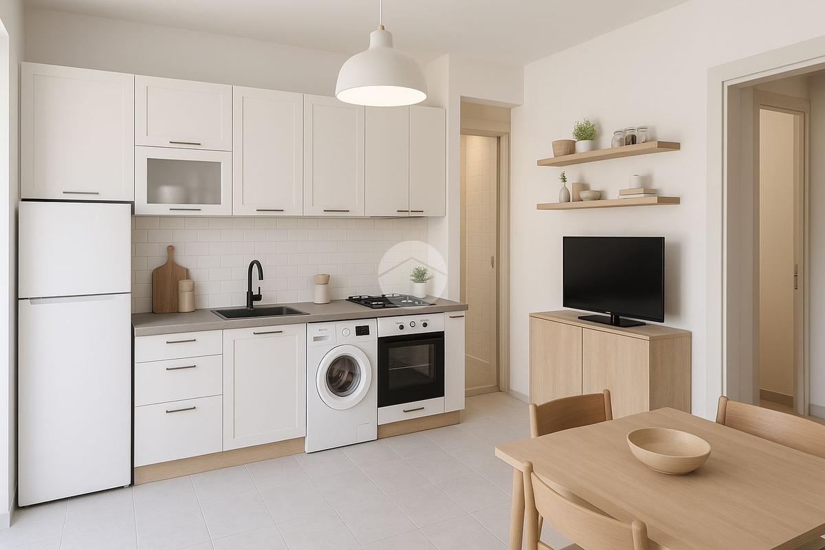 L’appartamento si apre su un luminoso soggiorno open-space con cucina a vista, uno spazio accogliente dove poter vivere momenti di relax. La zona notte comprende una camera matrimoniale con bagno privato, ideale per garantire la massima privacy, e un secondo bagno finestrato con doccia a servizio del soggiorno e degli ospiti.