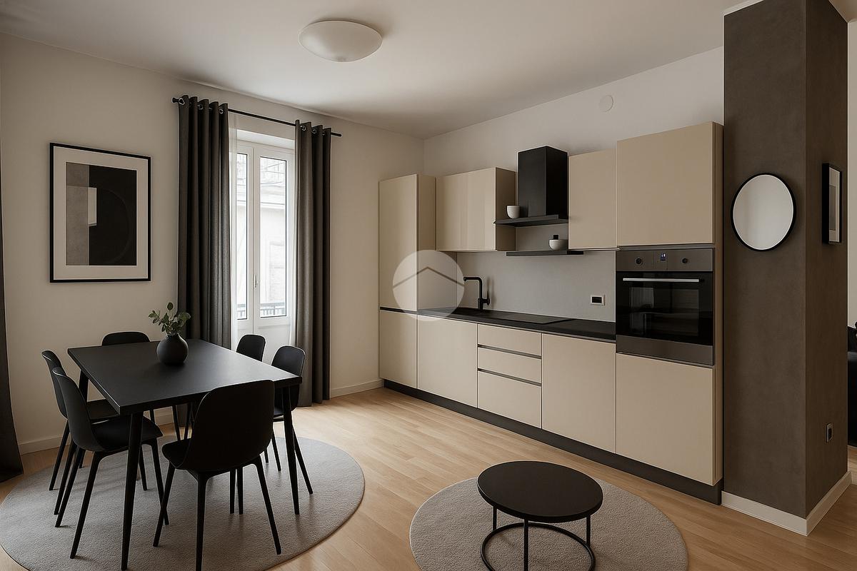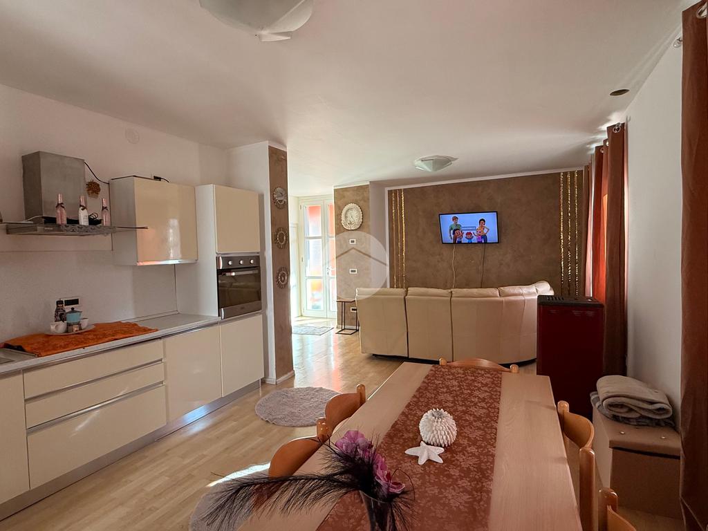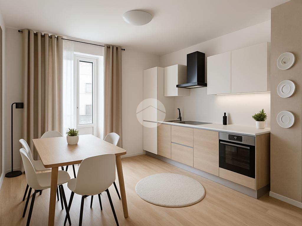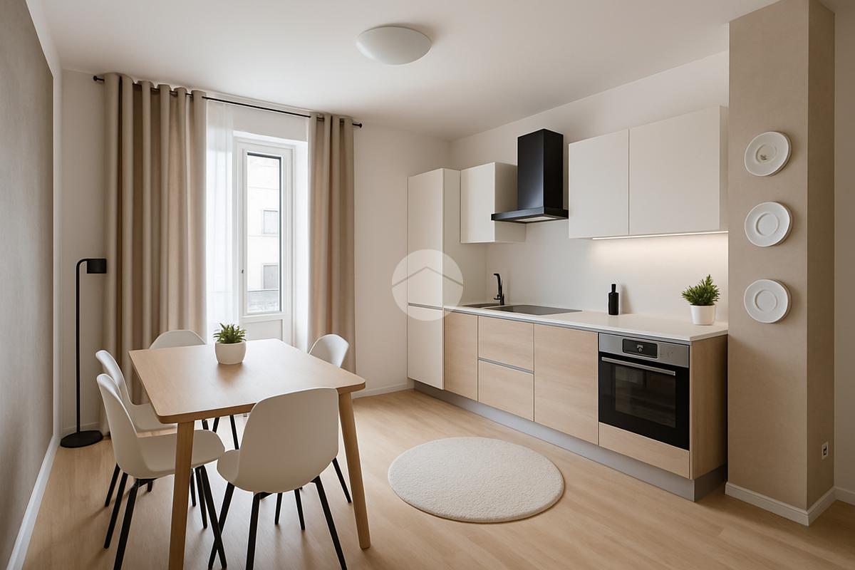 L’appartamento si apre su un’ampia zona giorno open-space, che unisce soggiorno e cucina, creando un ambiente luminoso e accogliente.