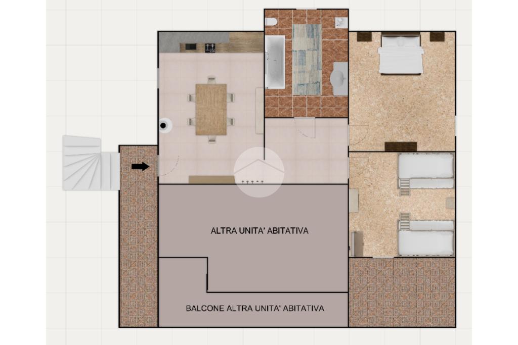 Si compone di una zona giorno con soggiorno e cucina a vista, due camere da letto e un bagno finestrato con vasca.