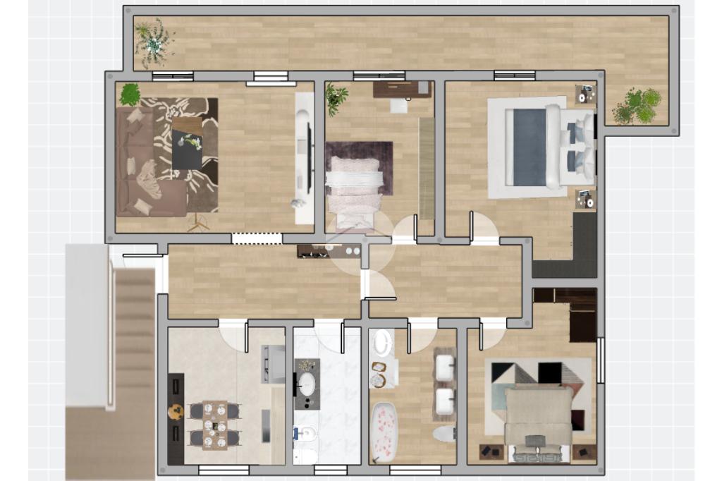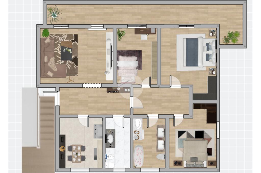 Un comodo disimpegno separa la zona giorno dalla zona notte, garantendo privacy e ordine degli spazi.