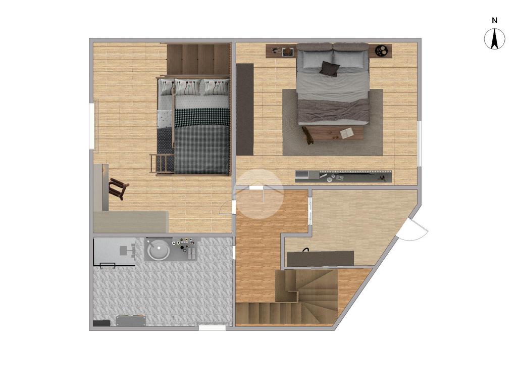 All’interno troviamo inoltre la scala che conduce al soppalco, dove sono stati ricavati quattro posti letto e un ampio bagno con doccia, soluzione ideale per ospitare amici e familiari o per creare uno spazio dedicato al relax.